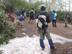 登山道の倒木や繁茂するネマガリダケの状況を確認しながら、赤倉登山道の上にある温泉管理小屋から分岐点の通称「天狗堂」まで進みました。燕温泉側からあがってきた班と合流し、石の祠の前でしばし休憩です。
