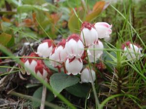 これはアカモノというツツジ科シラタマノキ属の常緑小低木で、真っ赤な実をつけることから「赤桃(あかもも)」と呼ばれていたのが、いつしか訛って「アカモノ」と呼ばれるようになったそうです。別名は「イワハゼ」。
