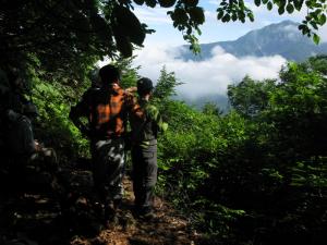 登る途中、雲間から雨飾山が顔を出すと、思わず歓声が。