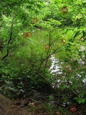 この池のほとりの写真、卵塊がいくつ見つけられますか?
