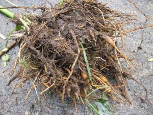 上の写真でもおわかり頂けるように、十分にヒゲ根が張っているので引き抜くにもにもなかなか引き抜けず、周囲を移植ゴテなどの道具を用いて掘り起こさなくては作業が進まない状態でした。