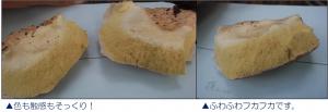 写真では分かりづらいですが、本当に焼きたてのパンのようにこんがりと茶色に色づいています。割ってみると・・・ふわふわしていて、蒸しパンのようです。お皿においてあったら、間違えて口にしてしまいそうなくらいそっくりです。