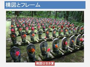 以上の写真は、構図の中に余分なものをいれない、という講義の中で使用した写真です。実はこの写真は、整然と地蔵郡が収まっていますが、周辺には蔵や近所の家があり、何を撮りたいのか、というテーマのもと、ひとつずつ引き算をして行った結果、このような構図になったそうです。