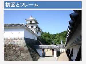 実はこの写真の特徴は、上下、左右の3分の1のあたりにポイントを置いているところです。普通に考えると、天守閣を中央に置きがちですが、左から3分の1あたりに天守閣、右から3分の1あたりに屋根、そして下から3分の1あたりに門を置くことで、城の奥行きや広大さが表現できるようになるのです。