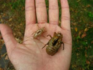 <小さいセミと大きなセミ、同じ木で羽化したようです>