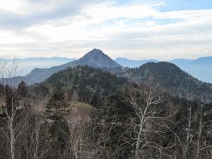 <円錐形に突き出た山が笠ヶ岳。遠くに見える山並みは北アルプス、戸隠、妙高。>