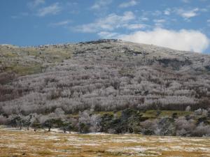 見上げる山々はうっすら白くなっています。