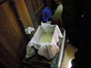 熱したものを麻袋に詰め絞ります。出てきているのは豆乳です。