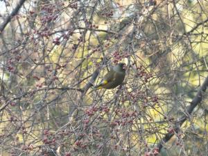 【12月初旬にグミの実を食べるカワラヒワ。まだ赤い実がたくさんなっています。】