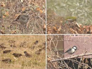 冬鳥のツグミを初め、メジロ、シジュウカラ、そしておなじみのスズメたち。