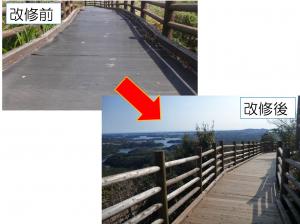 先日より床面の改修工事が行われていた横山展望台までのスロープですが、