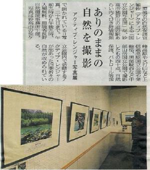 来年度の写真展は、平成23年度に長野自然環境事務所管内のアクティブ・レンジャー(自然保護官補佐)8名が撮影した写真40枚を、会場の広さにあわせて展示点数を調整しながら、1ヶ月に1会場を目安に管内を巡回展示する予定です。