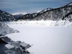いつもは真っ青な黒部ダムの湖面もまだまだ真っ白です。