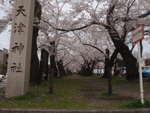 さて、今週の中頃に上越森林管理署での打合せに向かう道すがら眺めた、日本三大夜桜の一つ上越市高田公園のソメイヨシノはようやく花が多くなってきたところでしたが、同じ日の午後打合せのため訪問した糸魚川市役所の前、「中部北陸自然歩道」(※1)の天津神社(あまつじんじゃ)に向かう桜並木は…