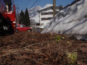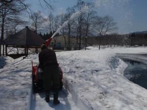 そう言いながら、すっかり春めいた明るい日差しの中、堅くしまって飛ばしにくい雪の除雪を少しずつ進めておられました。