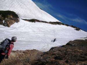中飯場から雪がついており、それから上は雪上を進みました。本日の雨で大分解けているでしょうけども、13日はみんな中飯場休憩舎から少し登った辺りからアイゼンを装着していました。