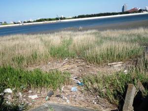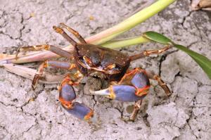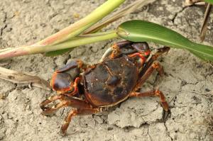 6月初旬の業務時間外に庄内川河口域を散歩していると、ヨシ原の中でガザガザと何者かが茂みに潜んでいる音がしたので周辺を探索すると大型のカニがヨシ原の奥に隠れているのを発見しました。素手で捕らえて確認するとハマガニという甲幅約5.5cmほどの大型のカニでした。夜行性で河口域の広いヨシ原内にこぶし大の大穴を掘って生息するカニです。同所的に生息するアシハラガニやベンケイガニ類に比べて体やハサミが大きく強そうな外部形態をしていますが、植物の葉を好んで食します。