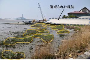 工事によって潮流が変化することで細かい粒子の泥が沖に流され、結果的に干潟が粗粒化したのかもしれません。また、この底質変化に伴ってヨシの分布が不連続となり、底生生物の生息分布も同時に変化したのではないかと考えられます。