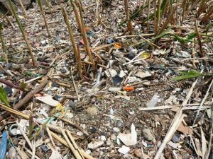 岸際のヨシ原は大潮満潮時であっても冠水することは無く、常に陸地となっていること、さらにヨシ原内に漂着した流木やゴミ類があまり移動せずその場に留まって存在することから、台風や大水時に砂利やゴミ等が一度に多量にヨシ原に漂着してヨシの根元を覆った状態となり、通常の潮汐変動ではこれらが海へ流出せずに陸地化が進行しているのではないでしょうか。