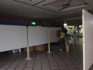 正面玄関を入ってすぐ、右手の大きなスペースを確保して頂き、パネルやその他の展示用具もすでに職員の皆様に準備して頂いてありました。市職員の方とともに、打合せをしながらより楽しんで頂けるような会場作りを心がけて設営をすすめました。