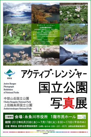 今年度の環境省アクティブ・レンジャー国立公園写真展は、平成23年度に長野自然環境事務所管内のアクティブ・レンジャー(自然保護官補佐)8名が撮影した写真40枚を、会場の広さにあわせて展示点数を調整しながら、1ヶ月に1会場を目安に管内を巡回展示する計画となっています。