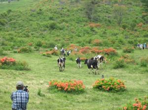 湯ノ丸山のレンゲツツジ群落の保全について、彼らの存在は欠かせません!なぜなら、このレンゲツツジ群落は彼ら“牛”の存在があったからこその光景なのです。(嬬恋村郷土資料館の資料によると「湯の丸高原は明治37年長野県東御市の牧野組合により家畜(牛・馬・綿羊)をおよそ300頭放牧。家畜は有毒なレンゲツツジを食べる事がなくレンゲツツジ群落が形成され、昭和31年5月15日に国の天然記念物に指定された。」との記述があり、家畜によりこの自然が形成されたことがわかります。現在では地元で組織している“レンゲツツジ保存会”により保全活動が行われています)繰り返しとなりますが、決して邪険に取り扱わないよう、優しく接して頂くようお願いします☆