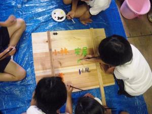 その後に、来年の6年生が設置する、フクジュソウの保全区を知らせる看板を作成しました。