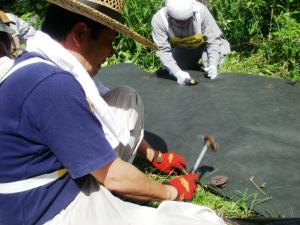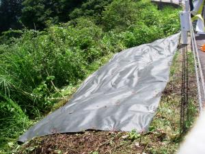 その後、今年度からは、根絶に向けた試験研究として、防草シートを上から被せました。今後モニタリングを行い、効果を確かめます。