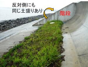 藤前活動センター前の南陽海岸堤防には幅約1.5m、長さ約10mの土盛りが堤防階段を挟んで東西に2カ所存在します。この土盛りは藤前干潟協議会において議論され、少しでも生き物が住めるような環境を造成しようと堤防施工者が誰でも簡単にできる技術で環境創造したものです。土盛りは他の場所の堤防工事で掘削して出た土を使用しており、完成した南陽堤防の傾斜部分に置かれました。この土盛りが作られてから約1.5年経ちますが、大雨や台風が通り過ぎてもその形を維持したまま存在し、現在では草が覆い茂り殺風景な堤防の一部が青々としてオアシスのようになっています。