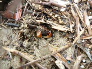 この土盛りを良く観察してみると誰かの巣穴や草の動きがあり、「キキュッ!」という鳴き声も聞こえてきました。どうやらここにはたくさんの生き物たちが暮らしているようです。あちらこちらに空いている巣穴がどうしても気になったので穴の中を枝でやさしく刺激し、お邪魔してみると穴の中から毛むくじゃらの逞しい足が数本出てきました。しばらくすると体全体を現したので確認すると赤い体と爪が特徴のベンケイガニでした。他の巣穴には黒っぽいクロベンケイガニが暮らしていました。直径1~3cm程度の穴は全てベンケイガニの巣穴であることが分かり、いずれも甲幅2cmほどの小型個体でした。堤防の完成により、内地と海が遮断されてしまい、普段海に近い内陸に住んでいて海に放卵する陸生カニたちは困っていましたが、この土盛りを利用することで険しい堤防を乗り越えなくても海にすぐ出ることができるようになりました。