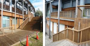 【塗装前の木造階段(写真左)と洗浄後のウッドデッキ床部分(写真右)】