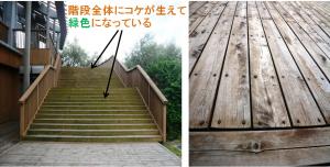 現在のウッドデッキ表面は擦れてケバケバしており、コケが生えている部分も見られ、落書きや日に焼けて脱色している箇所も確認されました。当センターは直射日光と海風が直接当たるので木材の風化が早く進行するようです。