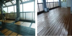【2階ウッドデッキ塗装作業の様子(写真左)と塗装直後の様子(写真右)】