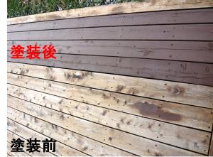 2階のウッドデッキから色塗りを開始して、階段→1階ウッドデッキへと進めるそうです。今回使用する塗料色は「ダークブラウン」。自然にも人体にも影響が少ない塗料を使用しています。塗装前後の色を比較するとその違いは明らかで、落ち着いた感じの色となります。