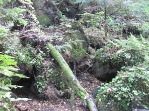 この岩塊はたまたま地表に見えていますが、地中にもこのような岩塊の集まりがあるのでしょう。しかし、その上に現在では林ができています。時間の経過とこの林を造った生物の営みのすごさを感じます。