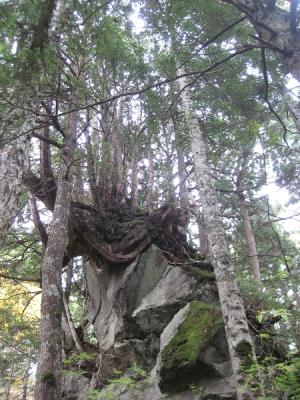 <溶岩からできた岩の上に株立ちのようになったクロベ(ネズコと呼ぶ人もいる)>