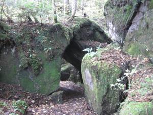 写真は志賀山の噴火で流れ出た溶岩からできた岩です。岩の重なった部分の下をくぐって向こうへ抜けられます。現地の解説によると「溶岩は粘り気の強いもので、固まりかけた溶岩を後から流出した溶岩がおしこわし、さまざまな大きさの岩塊の集まりをつくった」とあります。