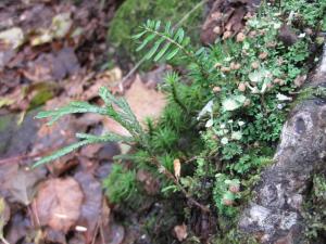 <2種類の針葉樹の稚樹(芽生え)、コケ類、地衣類、落葉、落枝。>