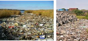 【庄内川河口域のヨシ原(写真左)と消波ブロック(写真右)に押し寄せる大量の漂着ゴミ】