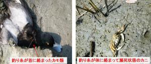 藤前干潟の国指定鳥獣保護区内では、庄内川や新川などから流出したゴミが干潟やヨシ原、堤防に多量に漂着します。この漂着ゴミをよく見るとペットボトルや発砲スチロール、プラスティック片などの水に浮くタイプのゴミが数多く見られます。これらのゴミは藤前水域の景観を損なうだけでなく、生き物が誤って食べてしまう、釣り糸や針が体に引っかかるなど生物にも多大な影響を与えています。