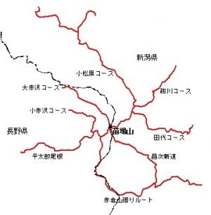 苗場山山頂に行くルートは大きく分けると8つあります。今回のルートは、長野県側から最も利用の多い小赤沢コースでもなく、新潟県側から最も利用の多い祓川コースでもありません。