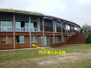 【穴が空けられたウッドデッキの柱】