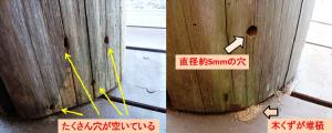 ウッドデッキの状態を確認する為にウッドデッキ周辺を見て回っていると、木製の化粧柱の根元部分に何やら直径5mmほどの穴がポツポツ空いていることに気づきました。