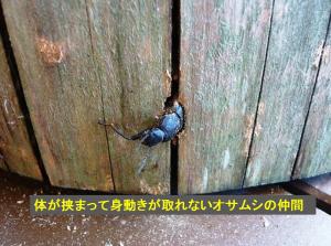 他の柱にも穴が空いていたので探ってみると、柱の穴から何やら黒い物質が飛び出ていることに気づきました。近づいてよく見てみるとオサムシの仲間が顔をひょっこり出しているではありませんか!頭部を触っても体をウネウネさせるだけで全く出てくる気配はありません。どうやら木に空いた穴の中から出ようとしたが途中で体が挟まってしまい、さらに木が乾燥して堅く締まり、身動きがとれない状態となっているようでした。助けてほしそうな顔をしていたので、指で優しく押したり引いたりしましたが、体が完全に詰まっており、救出することが出来ませんでした。翌日、確認してみるとオサムシの姿は無かったので、自力で脱出したのでしょうか?
