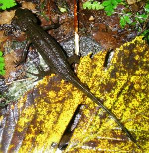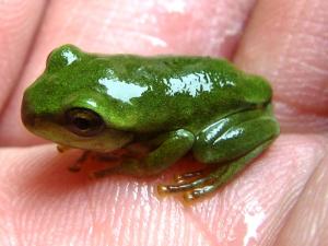 そこをピチャピチャと跳ぶ、小さなモリアオガエル君。