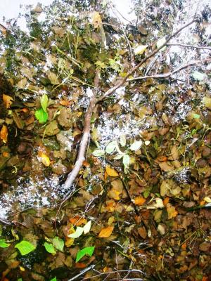 水面を落ち葉が覆っていて、色とりどりのアートが出来上がっていました。