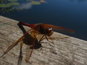やわらかな秋の光が黄色い羽根を木橋に写し、このトンボの特徴をはっきり伝えてくれます。