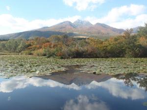 しばらく粘ると風は止み、いもり池に映る「逆さ妙高」と「三段錦」を同時に見ることもできました。