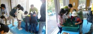 今回、私たちは藤前干潟に住む生き物を知ってもらうために、干潟のカニや貝、魚などを藤前干潟から連れて行き、タッチプールで皆さんに触れ合っていただきました。このタッチプールは子供達に大人気で、子供達はカニに触るのが怖くて初めは指の先でツンツンするだけでしたが、慣れてくるとカニを手の平に乗せたり、腕の上を歩かせたりと、興味津々の様子でした。カニを触るのは怖いので、動かなくて怖くないヤマトシジミだけを触る子供達もいました。