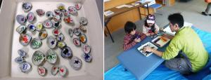 タッチプールの他にも、藤前干潟に住むヤマトシジミの貝殻を用いて、シジミの貝殻合わせを行いました。一対の貝殻の内側に同じ絵を描いてもらい、蝶番でパキンと割って裏返してトレイに配置します。これを神経衰弱の要領で自分が描いた絵を当ててもらうというゲームです。一対の貝殻でないと貝はピッタリ合わないので、二枚貝の遺伝的多様性に気づいていただけたかと思います。